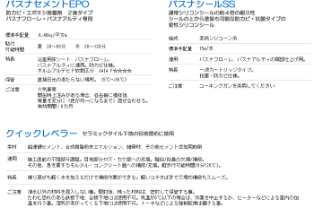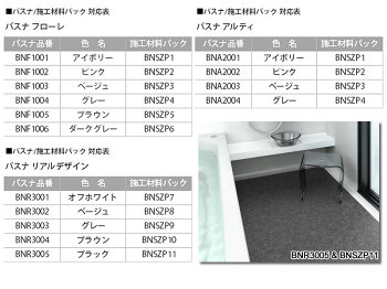 商品説明 商品名品番 東リ バスナフローレ・バスナアルティ用 施工材料パック 【バスナ フローレ / アルティ 共通品番】 ・BNSZP1 (フローレBNF1001 アルティBNA2001に対応)アイボリー ・BNSZP2 (フローレBNF1002 アルティBNA2002に対応)ピンク ・BNSZP3 (フローレBNF1003 アルティBNA2003に対応)ベージュ ・BNSZP4 (フローレBNF1004 アルティBNA2004に対応)グレー ・BNSZP5 (フローレBNF1005に対応)ブラウン ・BNSZP6 (フローレBNF1006に対応)ダークグレー バスナ リアルデザイン対応品番】 ・BNSZP7 (リアルデザインBNR3001に対応)オフホワイト ・BNSZP8 (リアルデザインBNR3002に対応)ベージュ ・BNSZP9 (リアルデザインBNR3003に対応)グレー ・BNSZP10 (リアルデザインBNR3004に対応)ブラウン ・BNSZP11 (リアルデザインBNR3005に対応)ブラック 家庭浴室、老健施設個浴室など2.5平方メートル以下の小面積施工に便利な材料パック 内容 バスナセメントEPO…1kgセット バスナシールSS…1本(333ml/本) クイックレベラー…1袋(1kg) かくはん容器…2個 ヘラ…1個 ハケ…1個 マスキングテープ…2個(18m/個) クイックレベラーはFRP樹脂下地には使用できません。