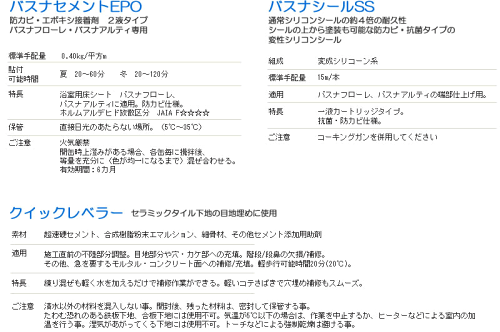 〜 浴室関連人気No.1 東リ バスナシリーズ〜 幅広い用途でダントツ人気 バスナフローレ 車椅子やカート利用場所に バスナアルティ リアルな質感が新しい バスナリアルデザイン 浴室のトータルコーディネート バスナウォール ユニット DIYで浴室リフォームするヒト、増えています東リ バスナ施工材料パック バスナフローレ・バスナアルティ用の浴室施工パック 家庭浴室、老健施設個浴室など2.5平米以下の小面積施工に便利な材料パックです ※クイックレベラーはFRP樹脂下地には使用できません。