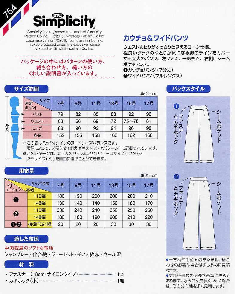 実物大型紙 ガウチョ&ワイドパンツ 754 シンプリシティ [送料無料] 大人 ボトムス 手作り