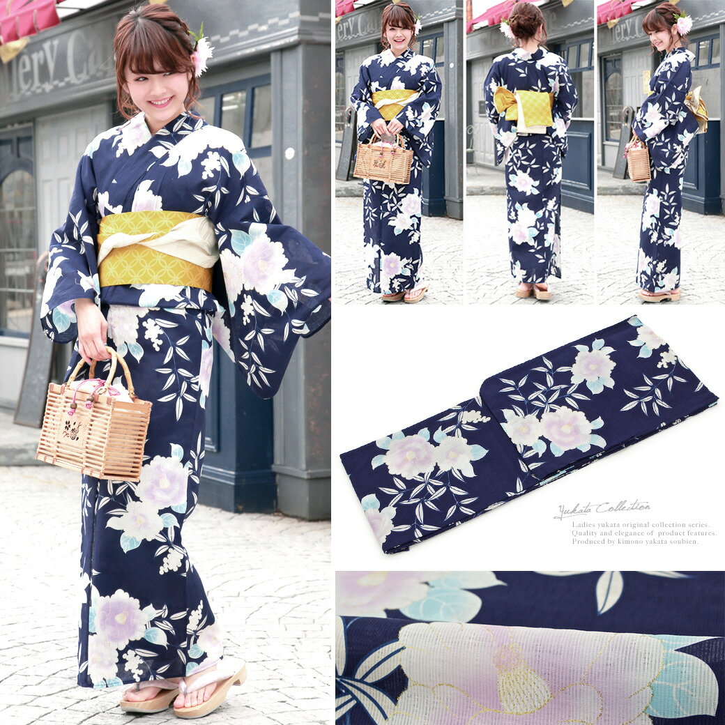 浴衣 セット レディース レトロ 浴衣セット 大人 3点セット 紺 ネイビー 黄色 アイボリー 椿 つばき 葉 ラメ 綿麻 半幅帯 女性 ボヌールセゾン 【送料無料】【あす楽対応】【浴衣 セット】